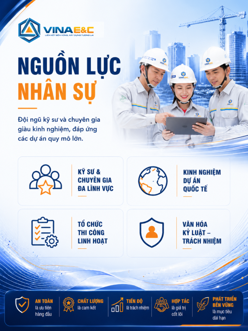 VINA E&C xác định con người là tài sản cốt lõi, đóng vai trò quyết định trong việc triển khai hiệu quả các dự án quy mô lớn và phức tạp.