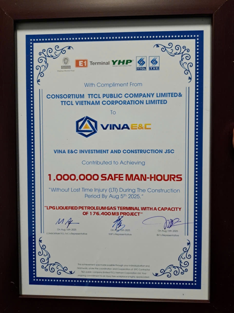 September 19, 2025 – VINA E&C Investment and Construction Joint Stock Company is proud to announce that the YHP LPG Terminal Project in Quang Ninh has officially reached the milestone of 1 million safe man-hours. This is a significant achievement that reaffirms VINA E&C’s absolute commitment to workplace safety and project quality.